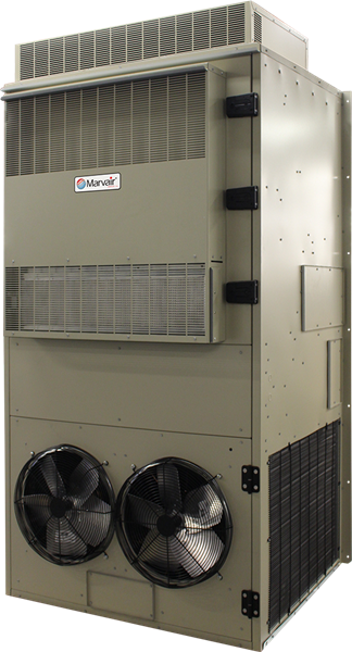The Marvair® MGH family of vertical exterior wall mount air conditioners are used primarily to cool electronic and communication equipment shelters. Due to the high internal heat load, these shelters require cooling even when outside temperatures drop below 60°F (15°C). Marvair air conditioners have the necessary controls and components for operation during these (less than 60°F [15°C) temperatures. All models use the non-ozone depleting R-454B refrigerant.